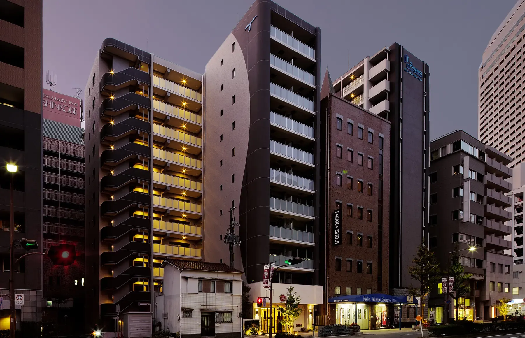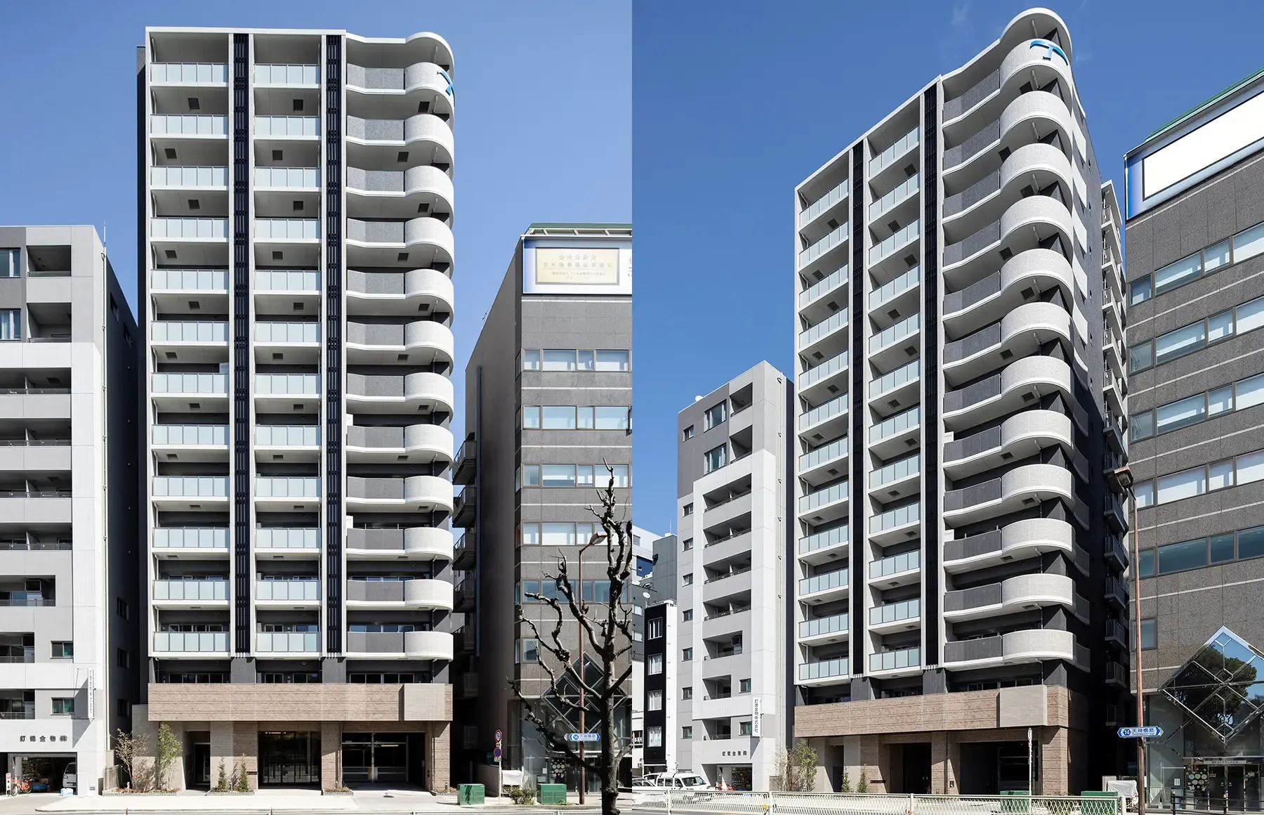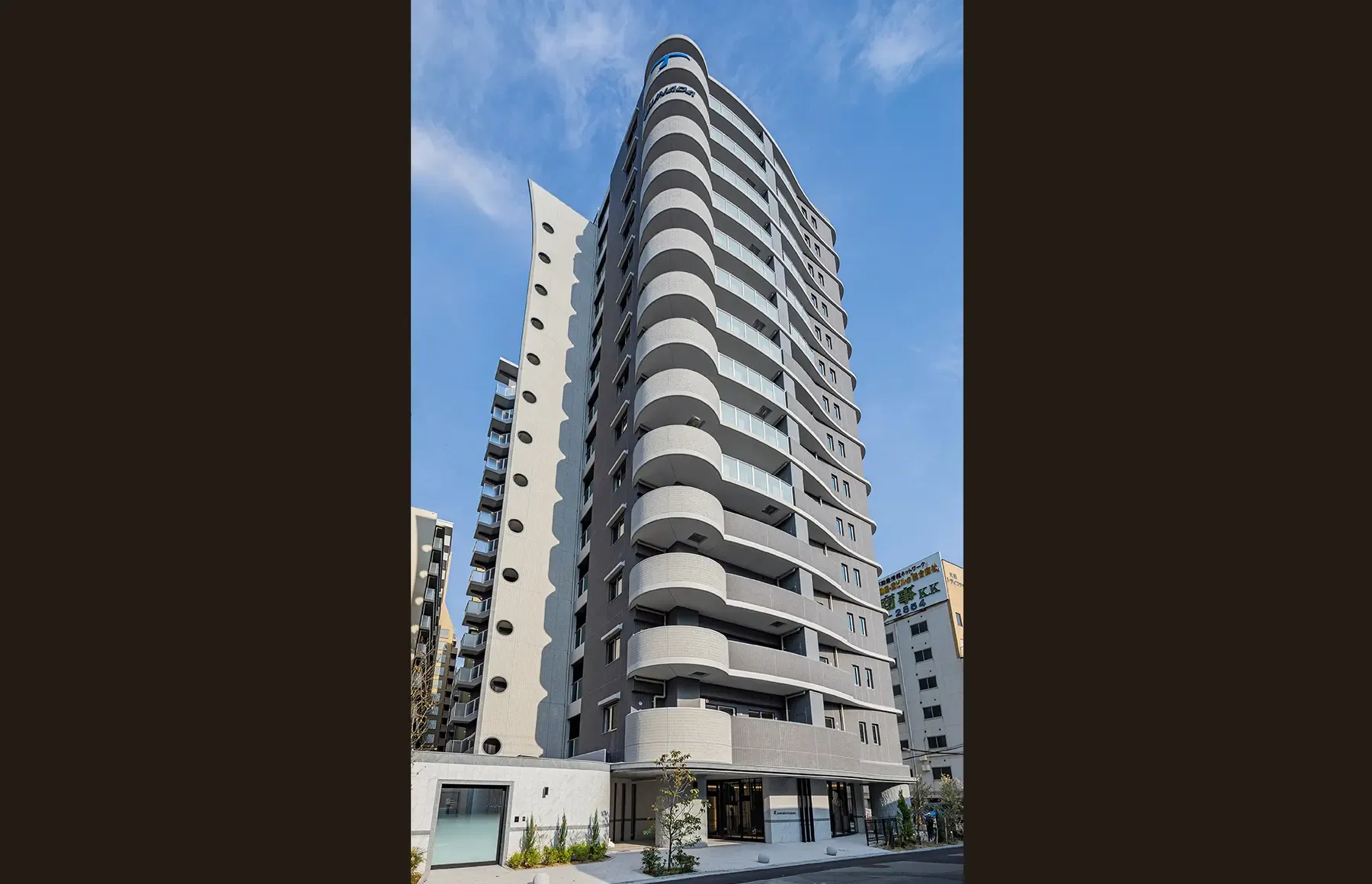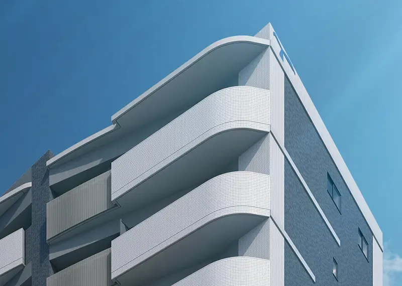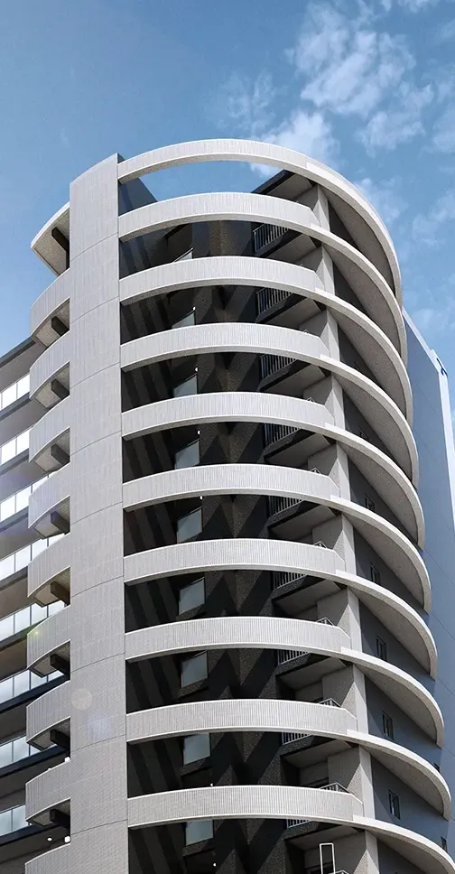 道路に面して進行方向に、軽快な曲線を描くバルコニー手摺を反復。印象的かつ洗練されたファサードを創出する。