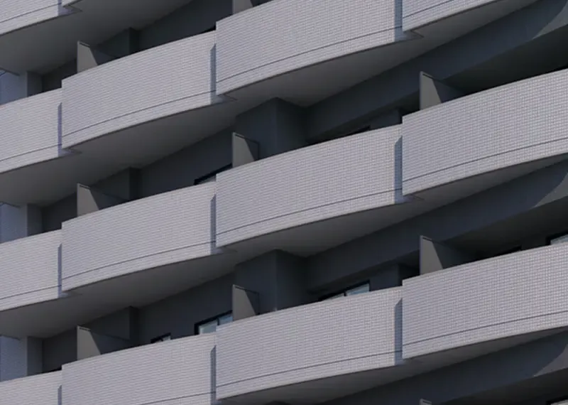 バルコニー同士が接する面は、曲線と直線が重なるソリッドな形状に。建物の表情に豊かな陰影を刻む。