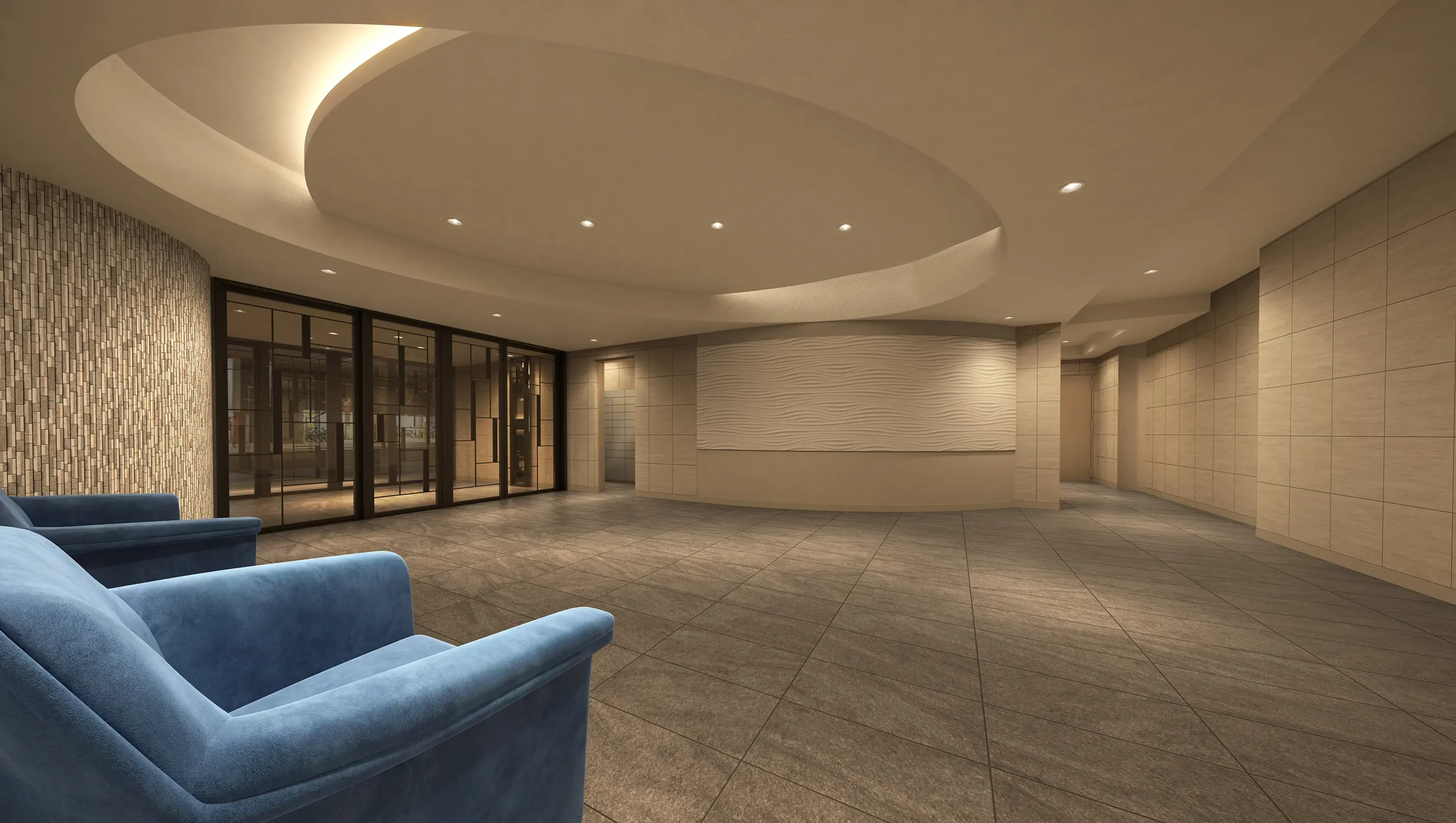エレベーターホールへ続くアールの壁面には、