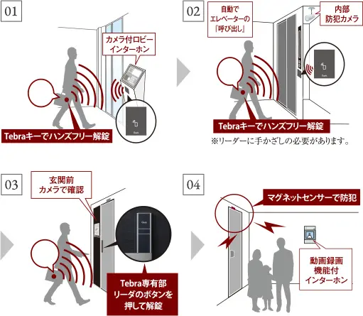 ハンズフリーキー「Tebra」を導入。キーを携帯するだけで、エントランスからエレベーター、住戸玄関までスムーズにアクセス可能です。
