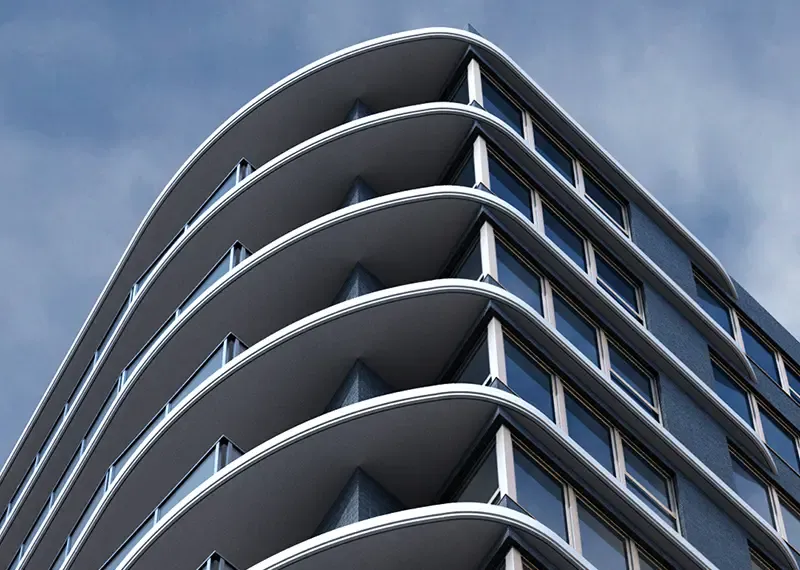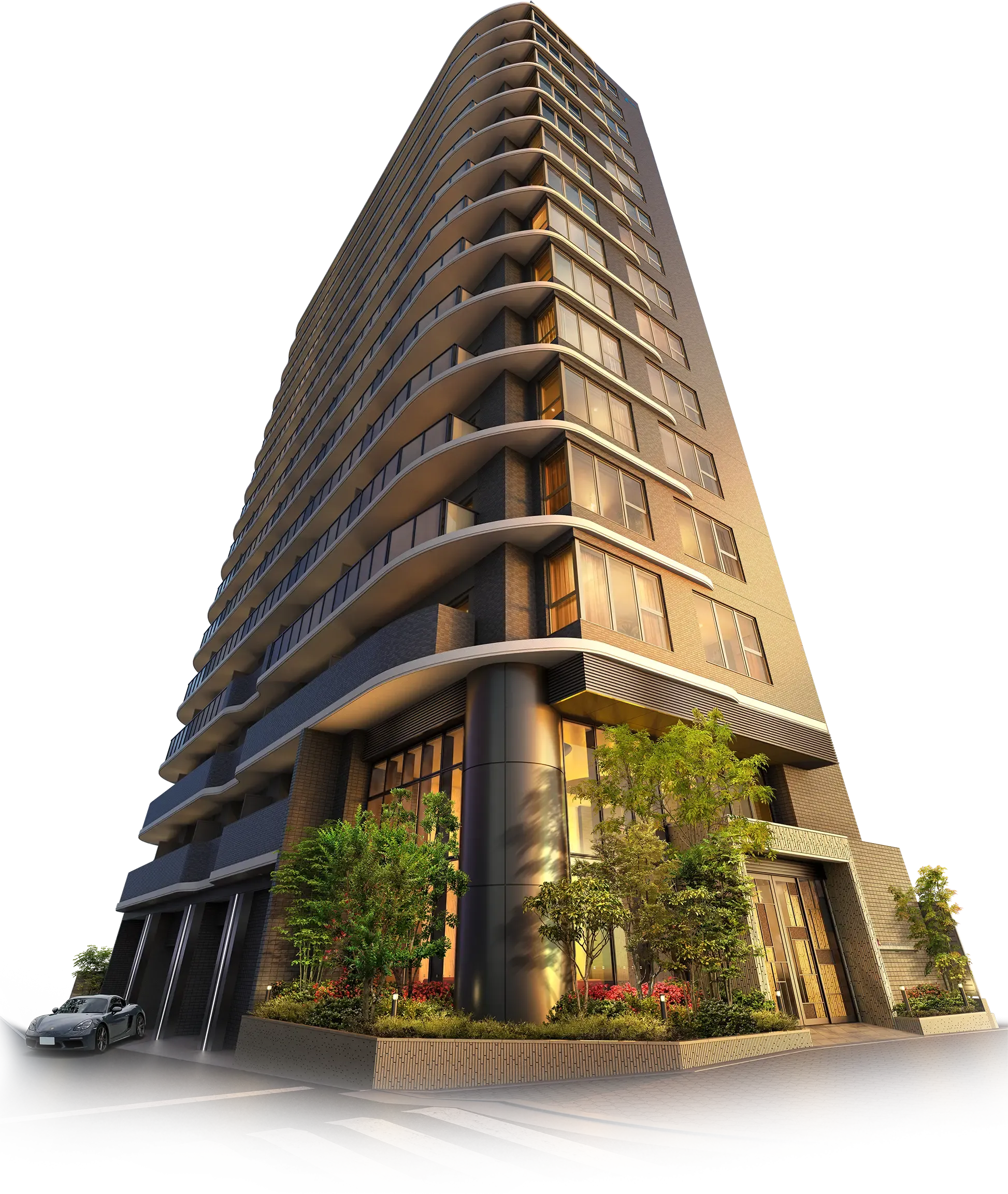 同じく南東角に、エレガントな曲線を描くスラブラインを最上階まで反復。有機的かつ洗練されたファサードを創出する。